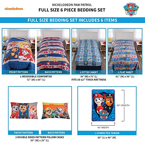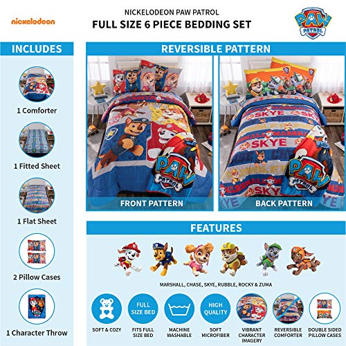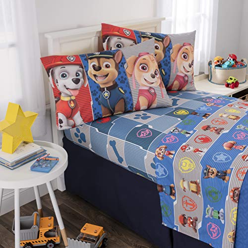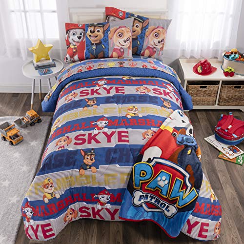 Set is available in a twin size 5 piece bedding set or a full size 6 piece bedding set.PAW PATROL DESIGN: No job is too big and no pup is too small when it comes to rescue missions or bedroom makeovers. Luckily, this cute and colorful bedding set featuring the popular Paw Patrol pups Marshall, Chase and Skye from Nickelodeon's hit series.